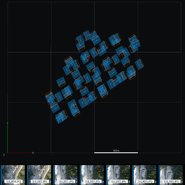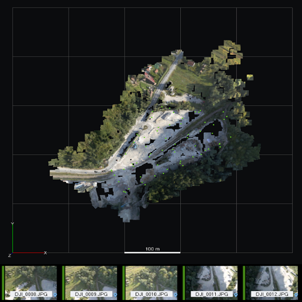Aerial photographs taken by drones are processed using specialized software. The processing of collected data involves loading the spatial coordinates of ground control points and captured photographs (Picture 3.a). These coordinates enable proper positioning of all collected photographs in space. The software algorithm reconstructs positioned photographs by filling in the “gaps” from all other available photographs (Picture 3.b).